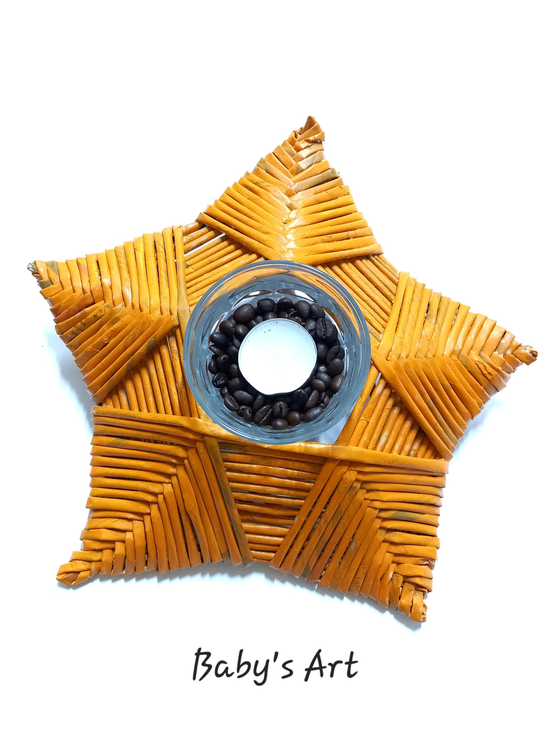 Centrotavola portacandela artigianale realizzato con cannucce di carta riciclata.