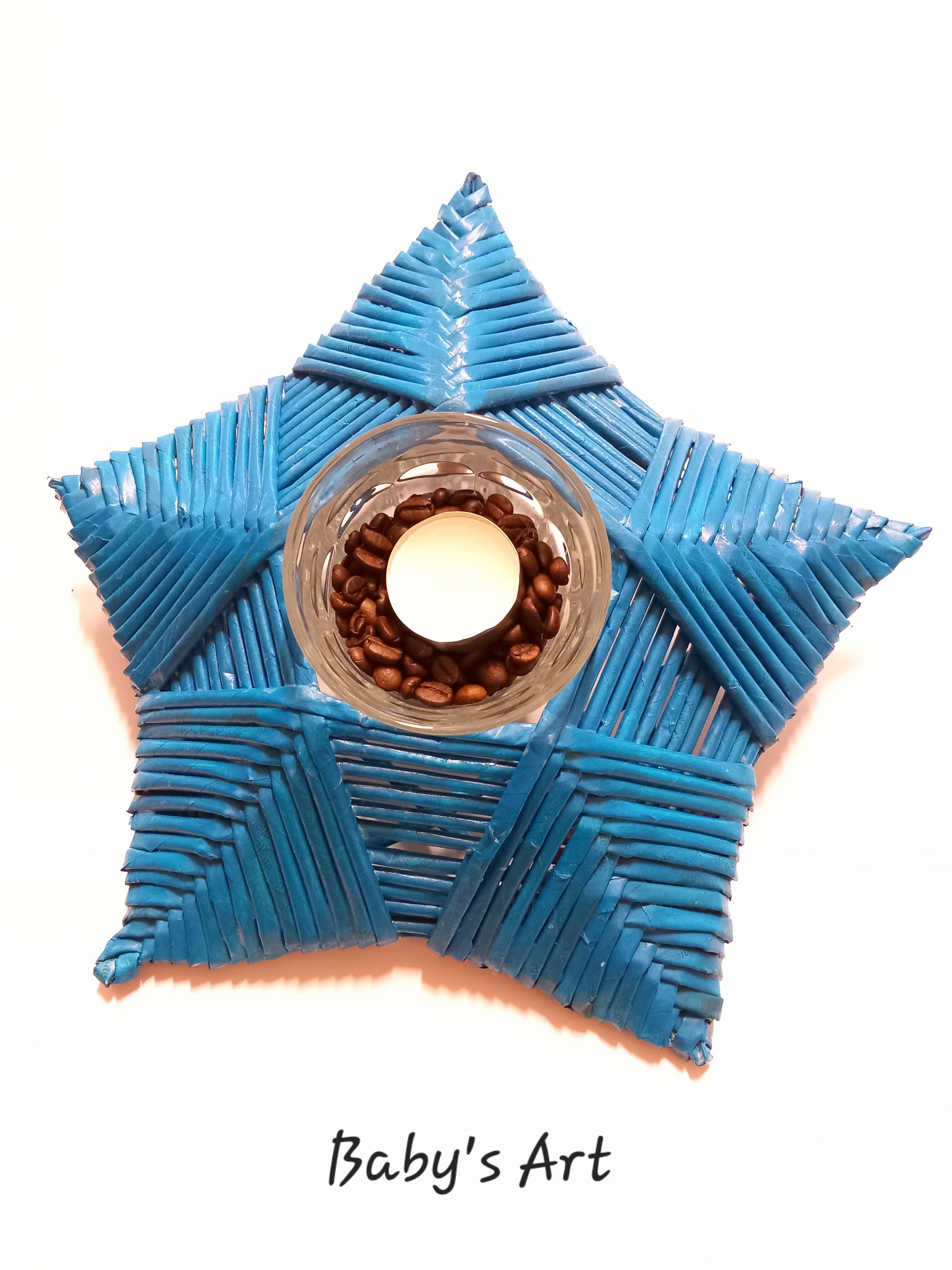 Centrotavola portacandela artigianale realizzato con cannucce di carta riciclata.