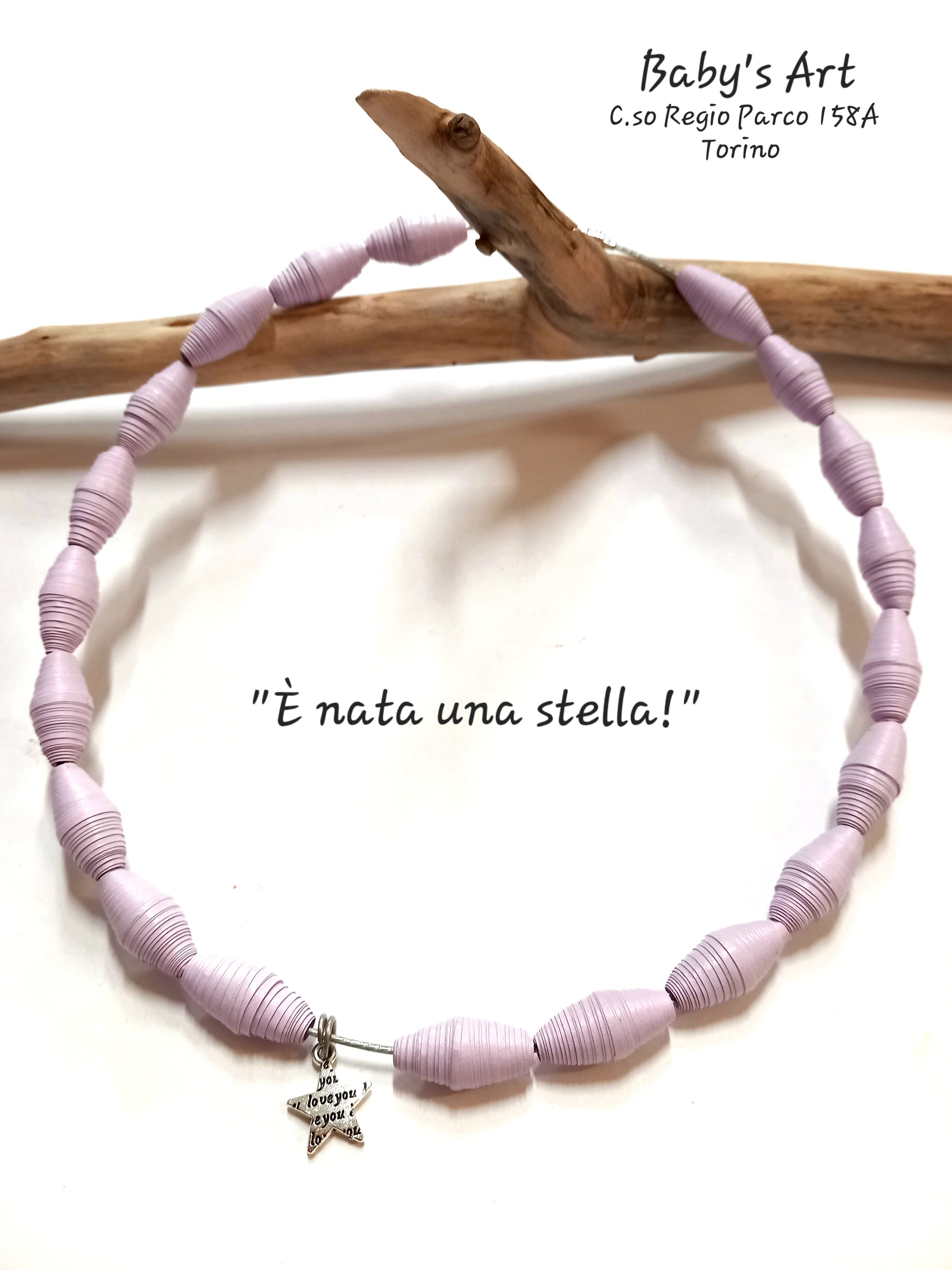 Collana artigianale realizzata con perle di carta e ciondolo in acciaio 'stella'.