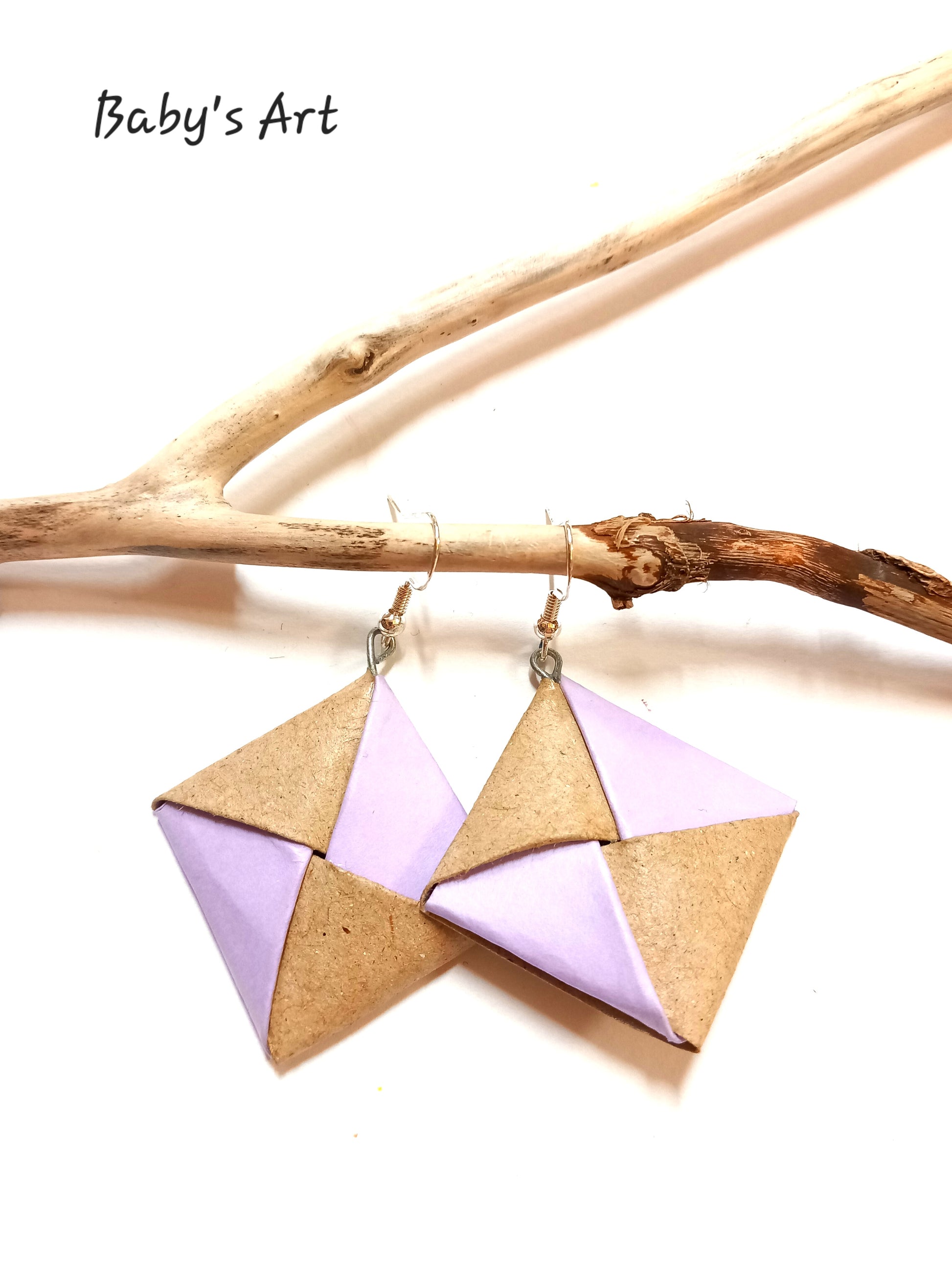 Orecchini artigianali di carta realizzati con la tecnica origami.