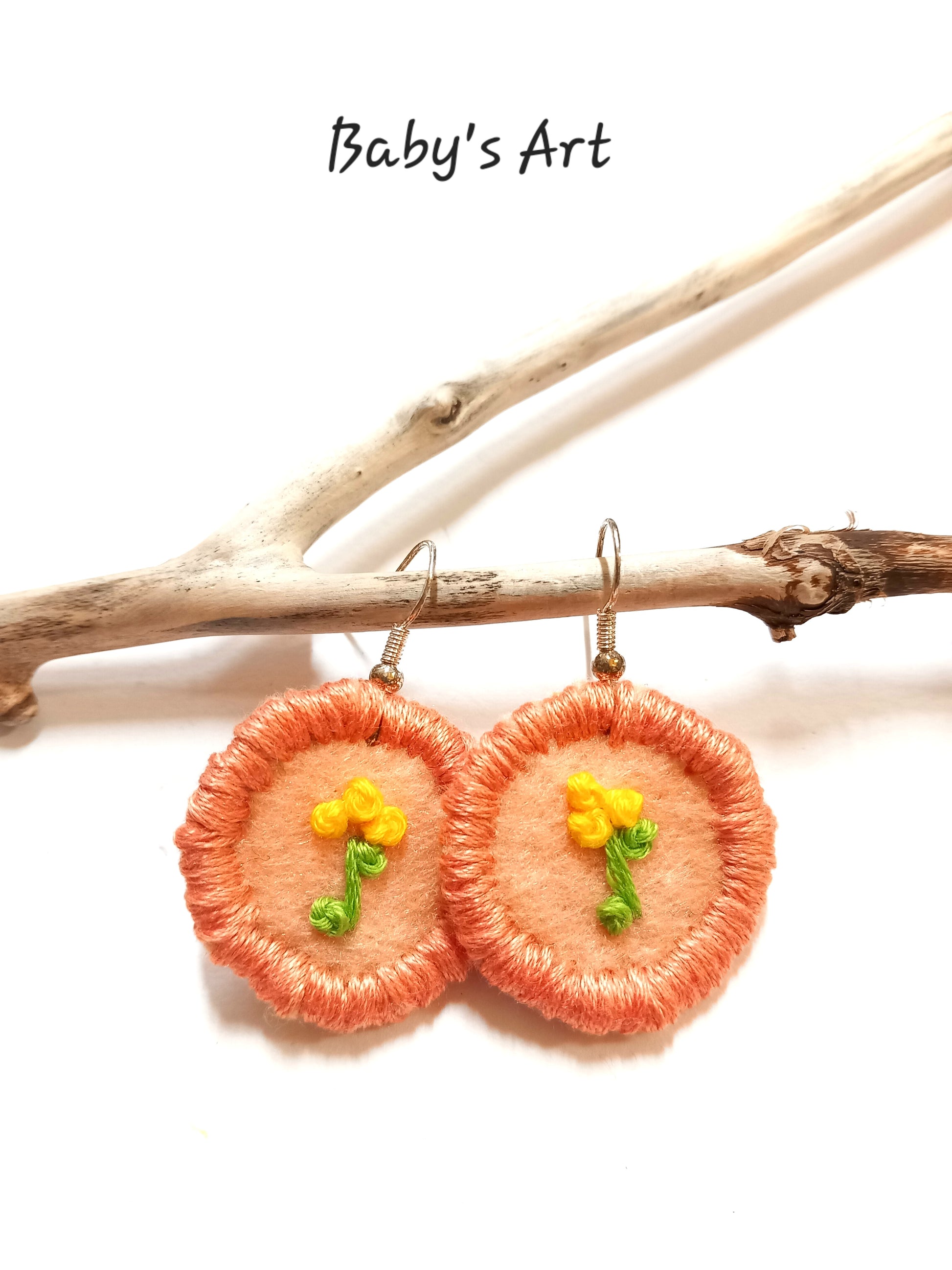 Orecchini artigianali di feltro ricamati a mano con fili di cotone.